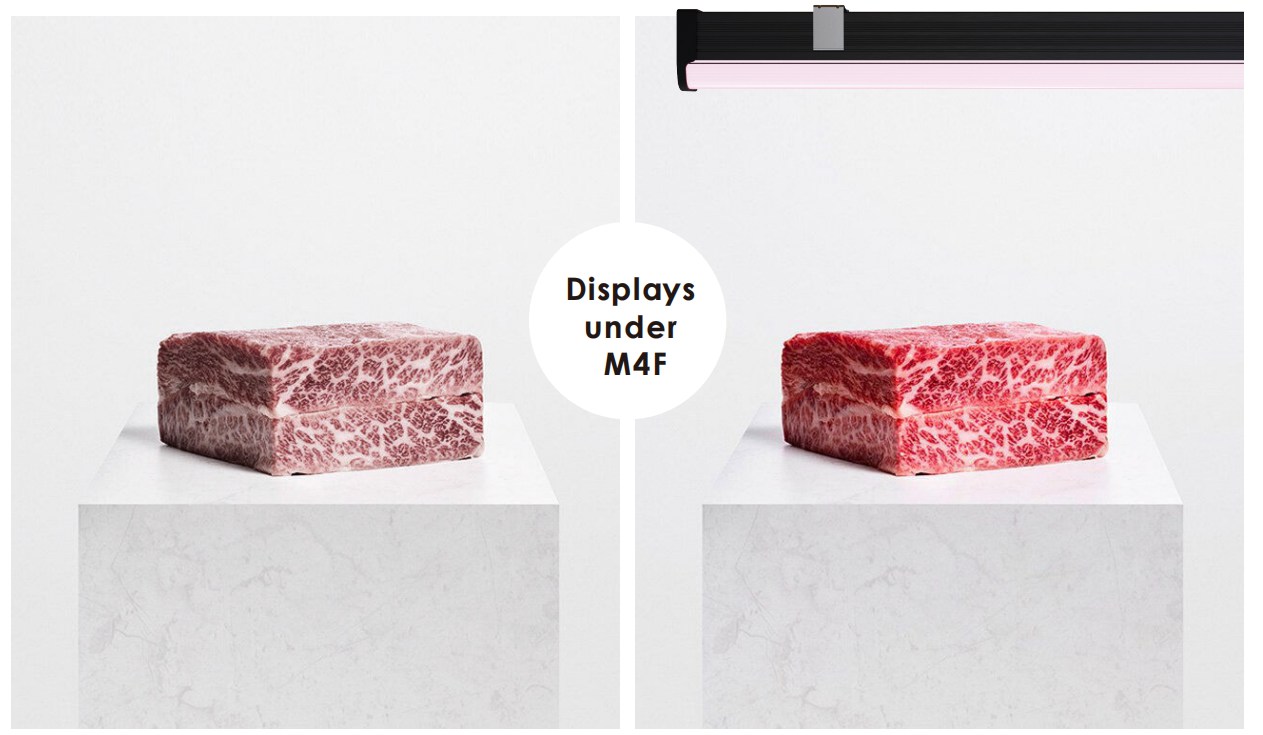 На основі надтонкої стрічки M4,Fanxstarвідкоригувала джерело світла, щоб зробити спектр 4000K+6500K+Red 660nm спеціально для м’ясного відділу в супермаркетах. Під освітленням цього м’ясного світлового спектру м’ясо, яке ми продаємо в супермаркетах, може виглядати соковитішим і свіжішим, тим самим збільшуючи продажі м’яса.