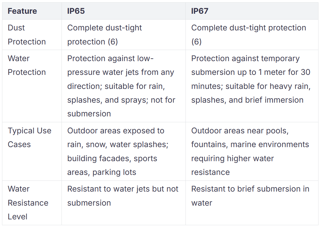 Порада: для світлодіодного ландшафтного освітлення в садах або на доріжках використовуйте водонепроникні світильники з принаймні IP65. Для док-станцій або басейнів вибирайте IP67 для найкращої водостійкості.