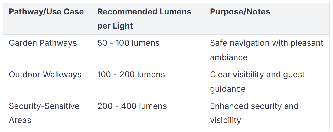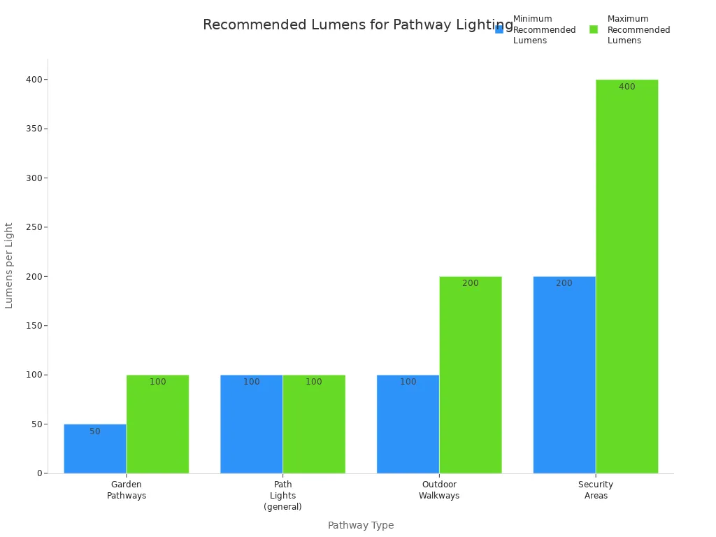 Важливо, щоб на вулиці були безпечні шляхи. Освітлення доріжок допомагає людям бачити, куди йти. Він також запобігає спотиканню та падінню. Для садових доріжок використовуйте світильники на 50-100 люмен. Для хорошого освітлення доріжок потрібно 100–200 люменів. Якщо вам потрібна більша безпека, використовуйте 200–400 люмен на світло. Розмістіть вуличні світлодіодні ліхтарі на відстані 6–8 футів один від одного для рівномірного освітлення. Вузькі стежки потребують освітлення ближче одне до одного. Широкі доріжки можуть мати вогні на більшій відстані одна від одної. Розмістіть вогні приблизно на 14 дюймів над землею. Це дає прямий промінь і робить доріжку гарною.