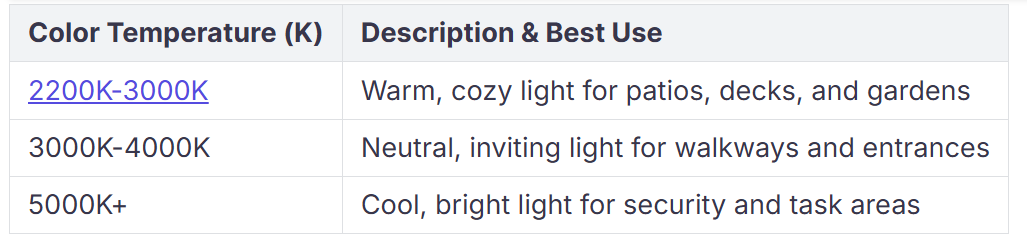 Нейтральні білі зовнішні світлодіодні лампи (3000K–4000K) роблять кольори рослин яскравими. Ця колірна температура допомагає зелені та квітам виглядати яскраво. Виберіть правильний світильник, як точкові світильники, прожектори або світлодіодні стрічки, для вашого саду.