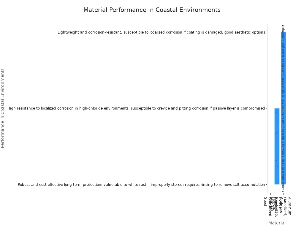 Виробники використовують порошкове покриття та герметичні кришки, щоб лампи служили довше. Ці функції допомагають світлодіодному освітленню, що захищає від погодних умов, витримувати шторми, вологе повітря та соляні бризки. Ви можете побачити, як різні матеріали працюють біля моря, на діаграмі нижче: