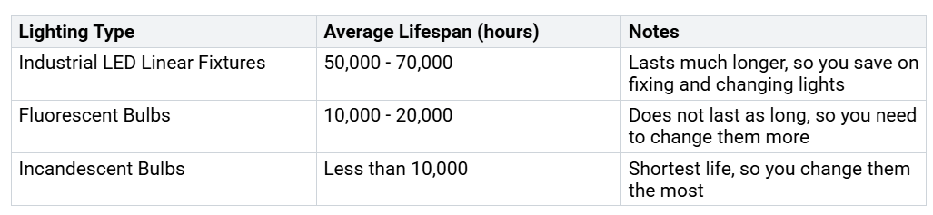 Більшість світлодіодних лінійних світильників працюють від 50 000 до 70 000 годин. Вони служать довго, тому підприємствам не потрібно їх часто міняти.